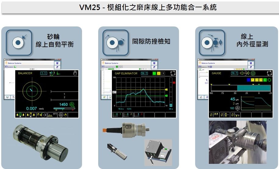 VM25是一款專為磨床設計的完全模組化系統的高性能應用,包括在1和2面的砂輪主軸上的自動平衡、利用音頻檢測來控制砂輪對工件或修砂的接觸、線上量測和線外量測(絕對或相對)等等的功能。